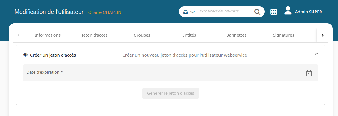 La date d'expiration est obligatoire à la création et elle est limitée à 1 an. Un seul jeton peut être créé par utilisateur webservice. Bien penser à copier le jeton dans un endroit sûr lors de la création car il n'est plus récupérable par la suite.