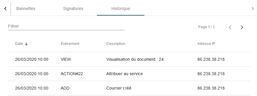 Cet écran permet d'accéder à l'historique des actions de l'utilisateur.