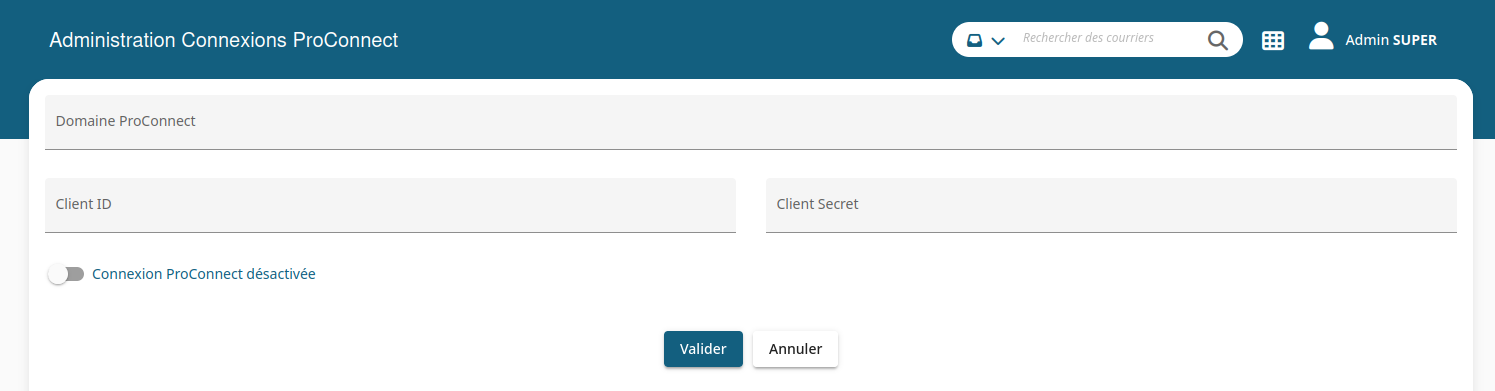 Cliquer sur le toggle pour activer / désactiver la connection ProConnect. A noter que ce mode de connexion n'est effectif que pour un mode de connexion Standard paramétré dans votre application MaarchCourrier
