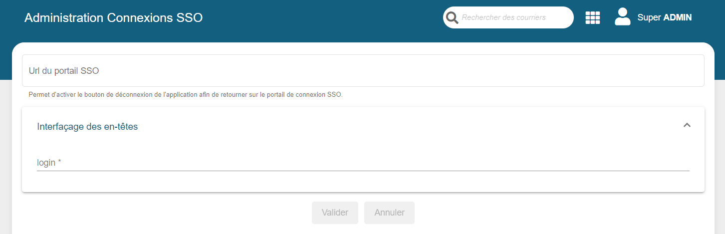 | interfaçage des en-têtes | En-tête paramétrable (Header du SSO contenant l'identifiant de l'utilisateur) |