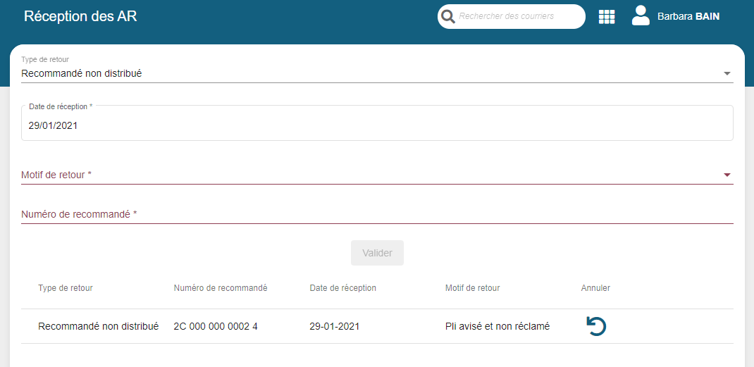 Après saisie, le bordereau est marqué comme distribué avec la date du jour de réception et le motif de non distribution.