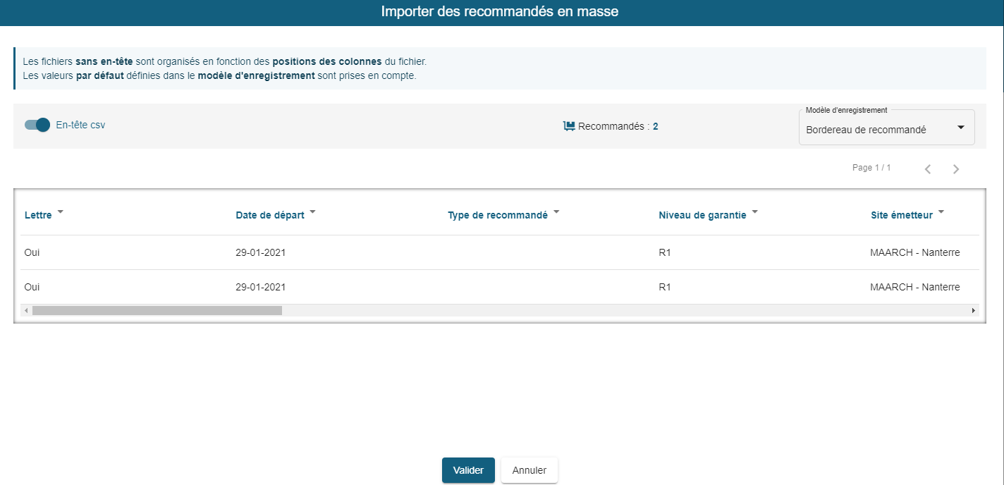 Le fichier doit comporter des envois relatifs à des bordereaux de mêmes types et options, réglables lors de l'importation.