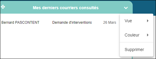 | Mes derniers courriers consultés | Affiche les 10 derniers courriers consultés par l'utilisateur | aucun | oui | oui | oui |