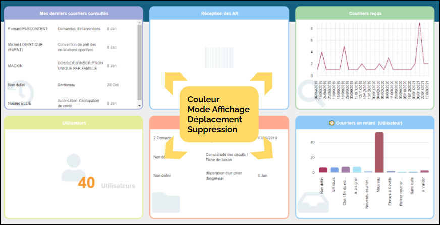 Maarch Courrier propose aux utilisateurs de personnaliser la page d'accueil en fonction de leurs besoins métier, au moyen d'un tableau de bord